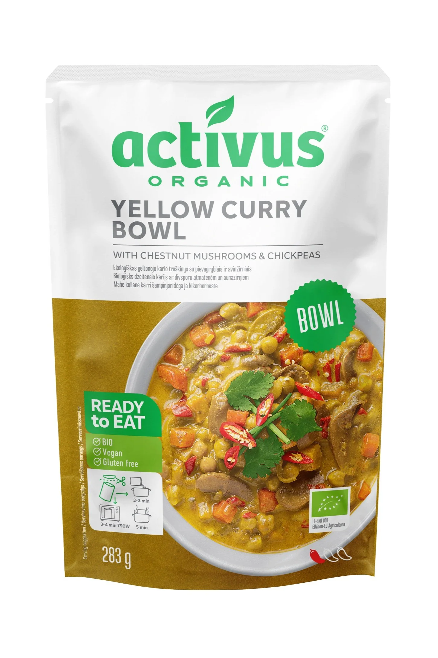 Yellow Curry Bowl er laget med Kantareller og Kikerter. Denne gule karriretten har også grønnsaker og ingredienser, som Bøkeskjellsopp, kokos-ekstrakt, Paprika, Gulrot, stekt løk, Chili, Thai curry mix og havsalt. Denne gule karriretten har en søt og mild smak, og karrikrydder-blandingen gjør den lett krydret.