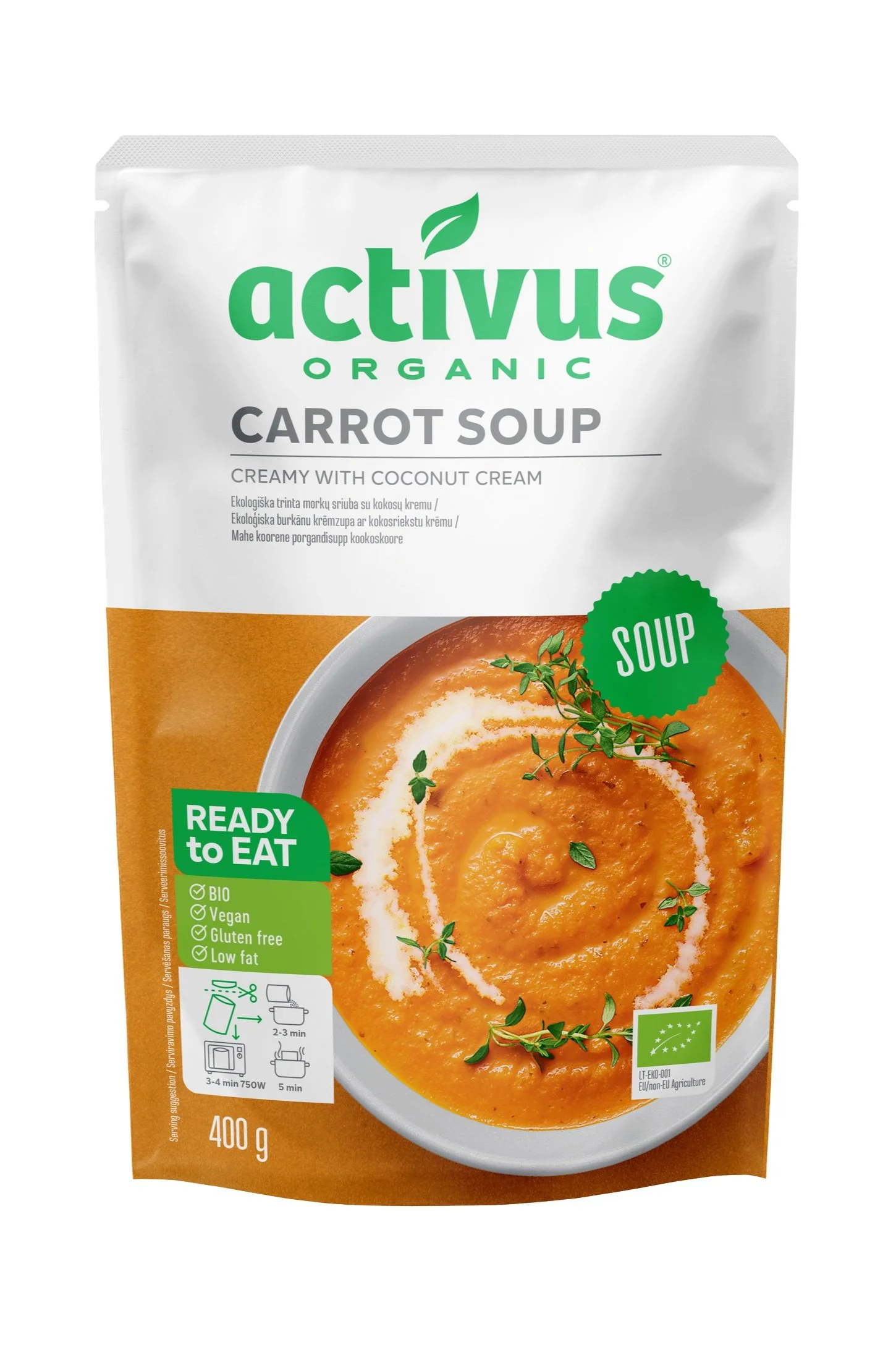 Carrot Soup Creamy er laget av økologiske gulrøtter og kokoskrem. Det er tilsatt krydder, løkpulver, rismel, hvitløkspulver og litt havsalt. Dette gir en fyldig og nydelig smak.
